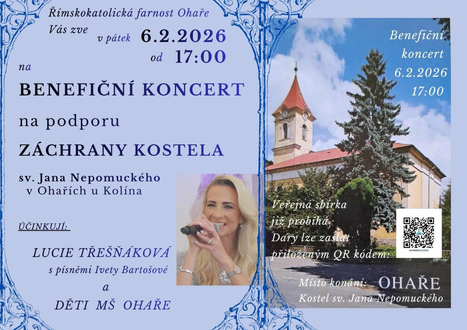 Benefiční koncert 6.2. od 17 hodin na podporu záchrany kostela sv. Jana Nepomuckého v Ohařích u Kolína. Účinkuje Lucie Třešňáková s písněmi Ivety Bartošové a děti z MŠ Ohaře.